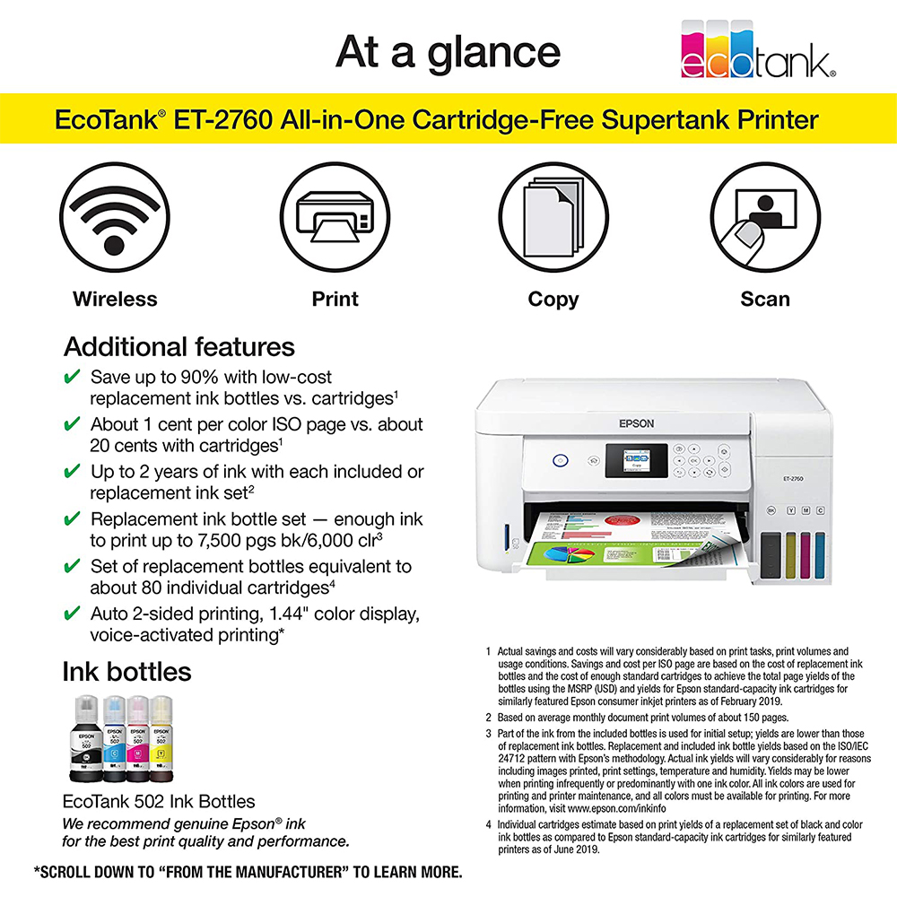 Epson EcoTank ET-2760 Wireless Color All-in-One Cartridge-Free Supertank Printer with Scanner and Copier